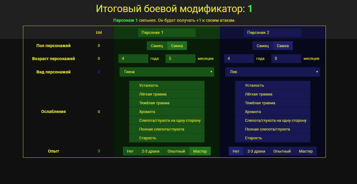 Теперь каждый может подсчитать боевой модификатор для дуэли между персонажами. Всё, что нужно сделать — пройти по ссылке сверху и заполнить небольшую форму. Останется только приложить ссылку либо скриншот на сохранённую форму к заявке на поиск ГМа.